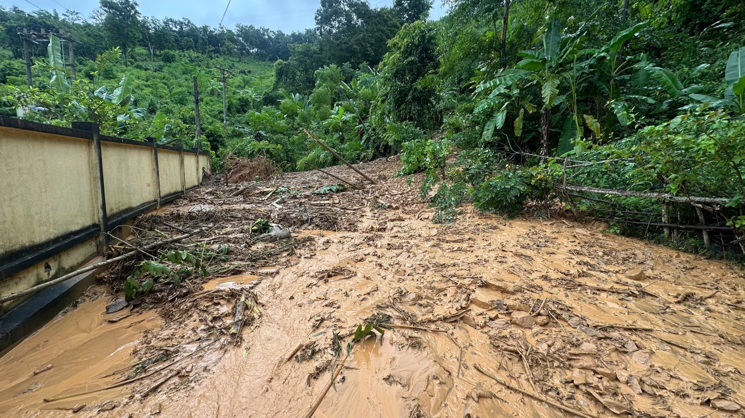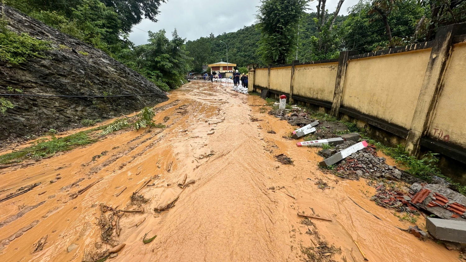| Mưa lớn gây sạt lở khiến hệ thống giao thông di chuyển khó khăn tại Nhà máy Thủy điện Nậm Nơn. |
