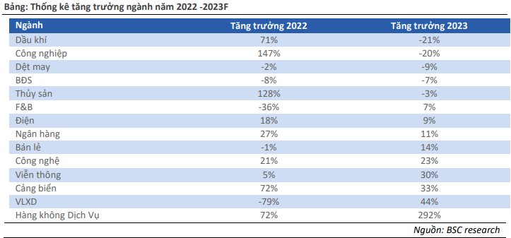 (3) Nhóm cổ phiếu có mức nền kết quả kinh doanh cao trong năm 2022 chịu áp lực tăng trưởng lợi nhuận năm 2023 gồm ngân hàng, thủy sản, dệt may, dầu khí (GAS và BSR), bất động sản, cảng biển và công nghiệp (hóa chất).