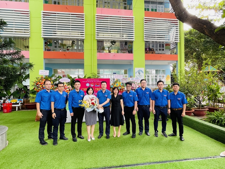 | Đoàn tặng hoa chúc mừng Ngày Nhà giáo Việt Nam 20/11 và chụp hình lưu niệm cùng các cô giáo Trường Mầm Non Sao Mai |