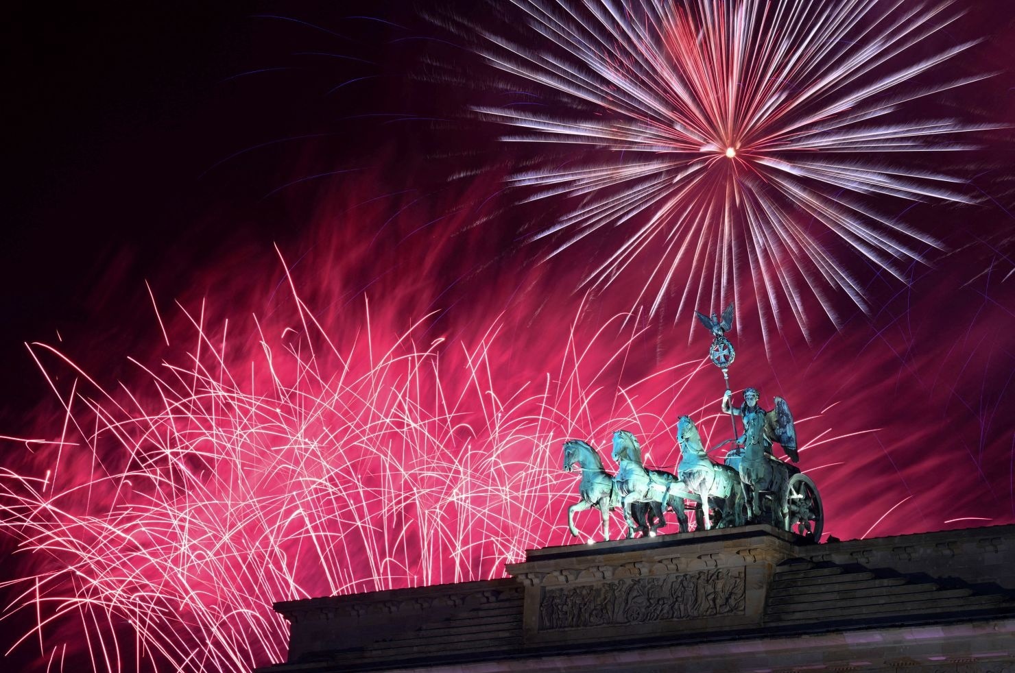 | Màn trình diễn pháo hoa rực rỡ trên Cổng thành Brandenburg, Berlin, Đức |