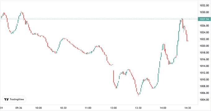 Chỉ số đại diện sàn HoSE khép lại phiên đầu tuần với một cây nến xanh, ghi nhận mức tăng nhẹ 0,58 điểm tương ứng 0,06% lên 1.027,94 điểm. Như vậy, biến động trong phiên này của VN-Index là hơn 20 điểm. VN30-Index thu hẹp thiệt hại, chỉ còn giảm 2,65 điểm tương ứng 0,26% còn 1.026,84 điểm.