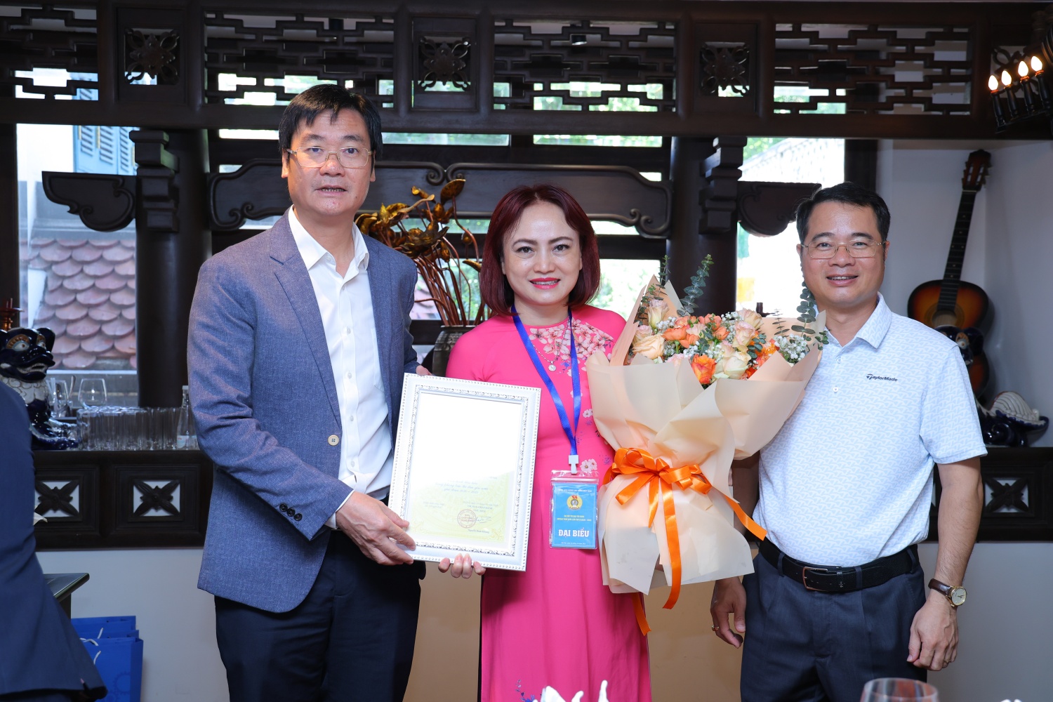 | Đồng chí Nghiêm Thùy Lan - Chủ tịch Công đoàn Petrovietnam và đồng chí Nguyễn Mạnh Kha - Phó Chủ tịch Thường trực Công đoàn Petrovietnam trao tặng Giấy chứng nhận và tặng hoa chúc mừng cá nhân điển hình tiên tiến. |