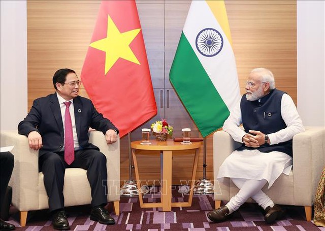 Bày tỏ vui mừng gặp lại Thủ tướng Ấn Độ Narendra Modi, Thủ tướng Chính phủ Phạm Minh Chính đánh giá cao những bước phát triển của quan hệ Đối tác chiến lược toàn diện Việt Nam - Ấn Độ. Thủ tướng chúc mừng những thành tựu ấn tượng mà Ấn Độ đã đạt được thời gian qua, đặc biệt là về khoa học vũ trụ, và bày tỏ mong muốn Ấn Độ tăng cường hợp tác nhiều mặt với Việt Nam, trong đó có đào tạo nguồn nhân lực, chuyển giao công nghệ. Thủ tướng Narendra Modi khẳng định Việt Nam là đối tác đặc biệt quan trọng của Ấn Độ, nhất trí với đề xuất của Thủ tướng Chính phủ Phạm Minh Chính về việc các cơ quan hai nước cần nghiên cứu, trao đổi về khả năng đàm phán Hiệp định thương mại tự do giữa hai nước. Thủ tướng Modi cho biết với năng lực cao về sản xuất chip bán dẫn, Ấn Độ sẵn sàng hợp tác, hỗ trợ Việt Nam xây dựng nguồn nhân lực trong lĩnh vực này, cũng như trong lĩnh vực công nghệ nói chung.
