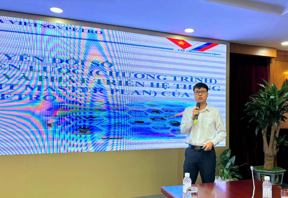 | Đồng chí Hoàng Tiến Lương - Thư ký Tổ điều phối dự án giới thiệu đến ĐVTN công tác chuyển đổi số tại Vietsovpetro |