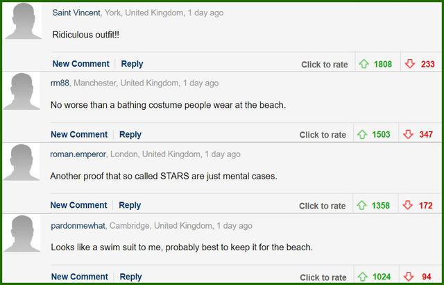 Độc giả Luvgingers2244: “Phạt là đúng. Tôi phát ngấy những ngôi sao ăn mặc thiếu lịch sự. Phụ nữ đã phải nỗ lực rất nhiều để được đối xử bình đẳng trong xã hội, nhưng có những nhân vật nổi tiếng hiện nay không hiểu được tất cả những nỗ lực ấy”.