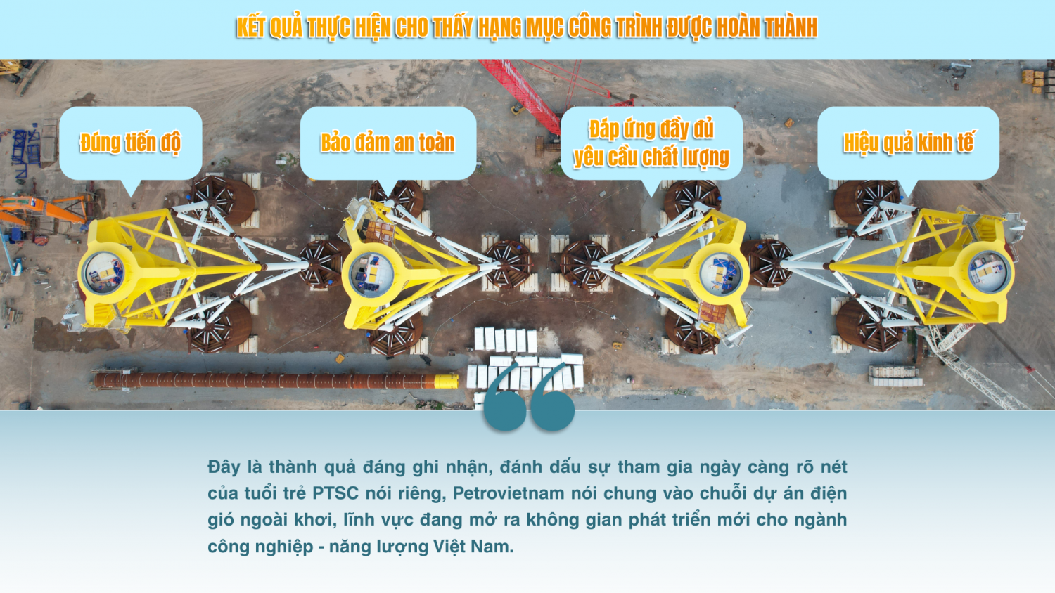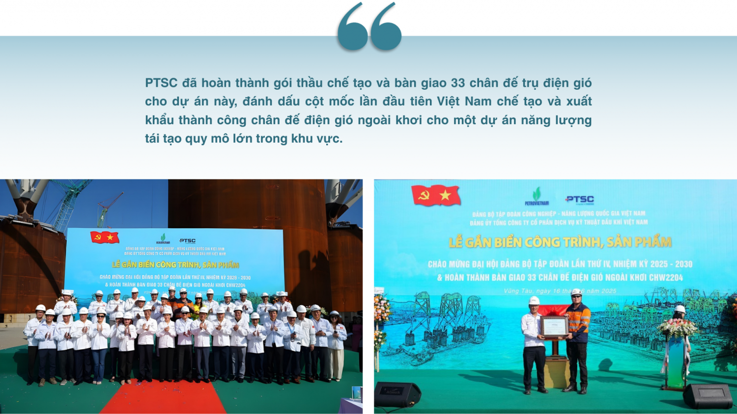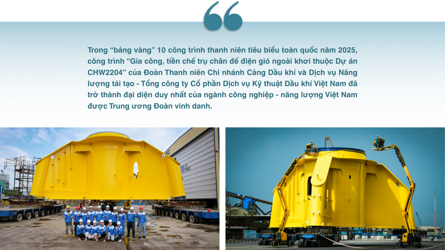 Năm 2025, các công trình thanh niên của lực lượng Đoàn Thanh niên Tập đoàn Công nghiệp - Năng lượng Quốc gia Việt nam (Petrovietnam) tiếp tục ghi dấu ấn trong việc đồng hành cùng nhiệm vụ sản xuất - kinh doanh, giải quyết các vấn đề thực tiễn của đất nước. Công trình “Gia công, tiền chế trụ chân đế điện gió ngoài khơi thuộc Dự án CHW2204” được Đoàn cơ sở Chi nhánh PTSC - Cảng Dầu khí và Dịch vụ Năng lượng tái tạo (PTSC Supply Base) trực tiếp tổ chức thực hiện, nằm trong khuôn khổ phong trào thi đua và định hướng hành động của Đoàn Thanh niên Tổng công ty Cổ phần Dịch vụ Kỹ thuật Dầu khí Việt Nam (PTSC) và Đoàn Thanh niên Tập đoàn, gắn chặt mục tiêu công tác Đoàn với nhiệm vụ sản xuất kinh doanh, thực hiện các công trình trọng điểm.