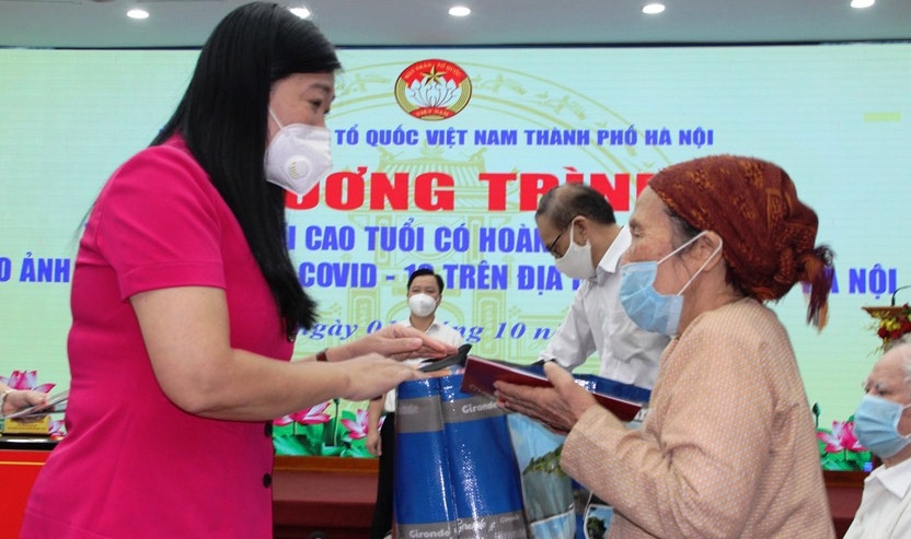 | Chủ tịch Ủy ban MTTQ Việt Nam TP Hà Nội Nguyễn Lan Hương trao quà cho người cao tuổi |