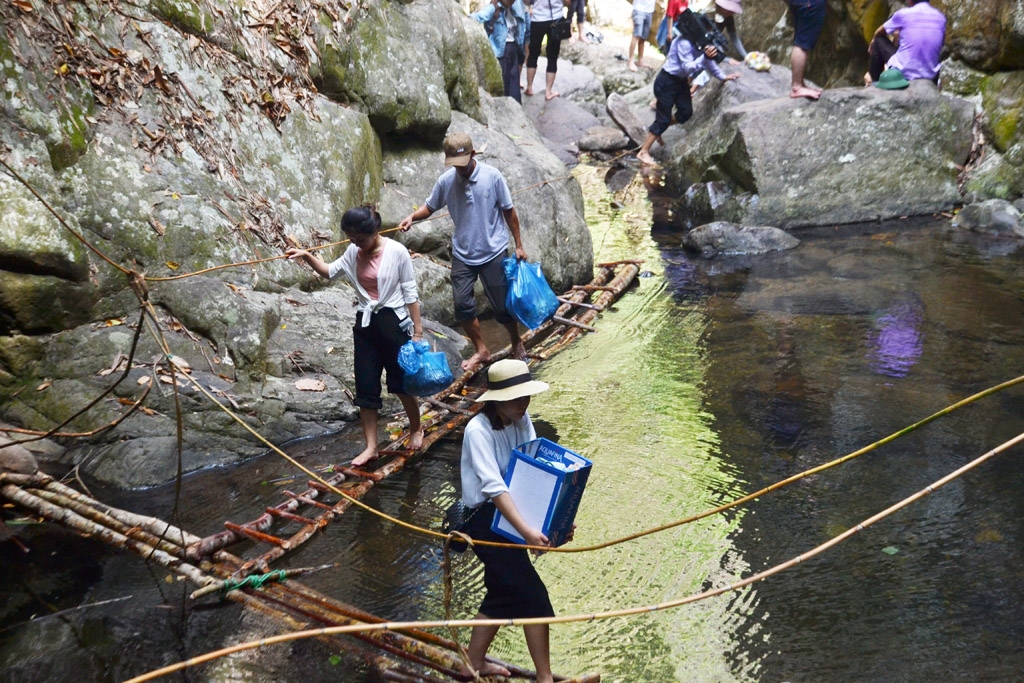 | Người dân dựng nhiều cầu khỉ để vào thác |