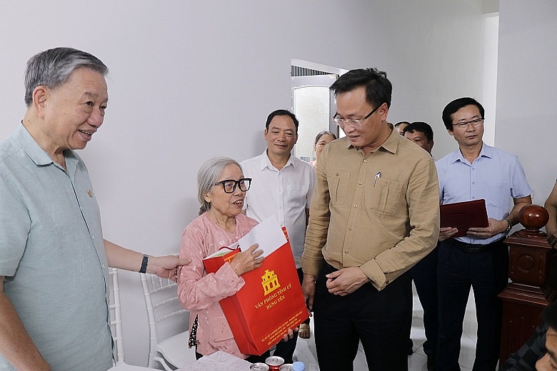| Đại tướng Tô Lâm cùng các đồng chí lãnh đạo thăm hỏi gia đình cụ Nguyễn Thị Dung. |
