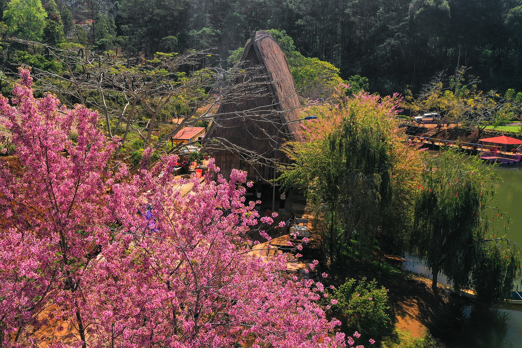 Nhà rông bên bờ hồ Đăk Ke rợp sắc hoa mai anh đào.