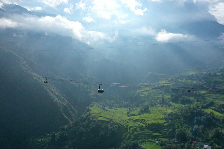 Bên cạnh dạo bộ, du khách lựa chọn “góc nhìn của những chú chim”, để ngắm khung cảnh mùa lúa ngoạn mục của Sa Pa trên tuyến cáp treo tới đỉnh thiêng Fansipan. Nắng hè rọi soi qua những áng mây tạo thành những vệt sáng tối điểm tô cho khung cảnh hùng vĩ của núi rừng Hoàng Liên Sơn và cả những thung lũng xanh màu lúa mới.
