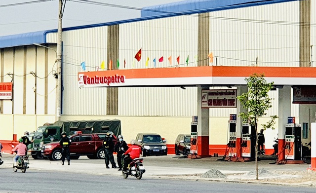 | Lực lượng Cảnh sát cơ động bảo vệ khu vực bị phong tỏa để để cơ quan điều tra lấy mẫu xăng dầu tại các cây xăng Vân Trúc. |