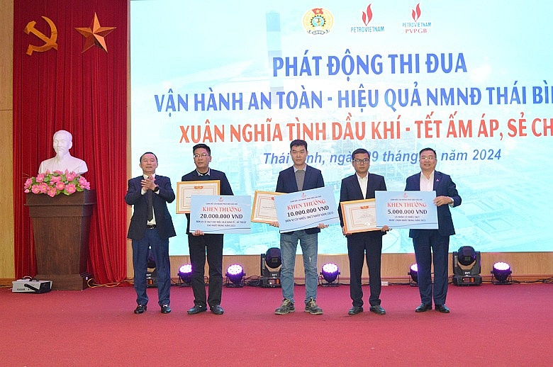 | Đồng chí Phan Tử Giang - Phó Tổng Giám đốc Petrovietnam và đồng chí Nghiêm Thùy Lan - Chủ tịch Công đoàn DKVN tặng Bằng khen cho các cá nhân có thành tích xuất sắc trong phong trào thi đua “Vận hành An toàn – hiệu quả NMNĐ Thái Bình 2”. |