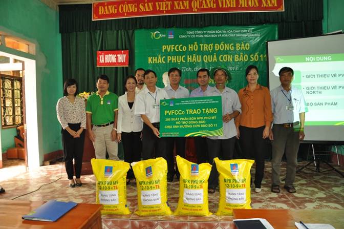Tại đây, PVFCCo/PVFCCo North đã trao tặng 280 bao phân bón Phú Mỹ (25kg/bao) cho bà con nông dân xã Hương Thủy với mong muốn giúp khắc phục phần nào những khó khăn và giúp bà con nhanh chóng ổn định sản xuất.