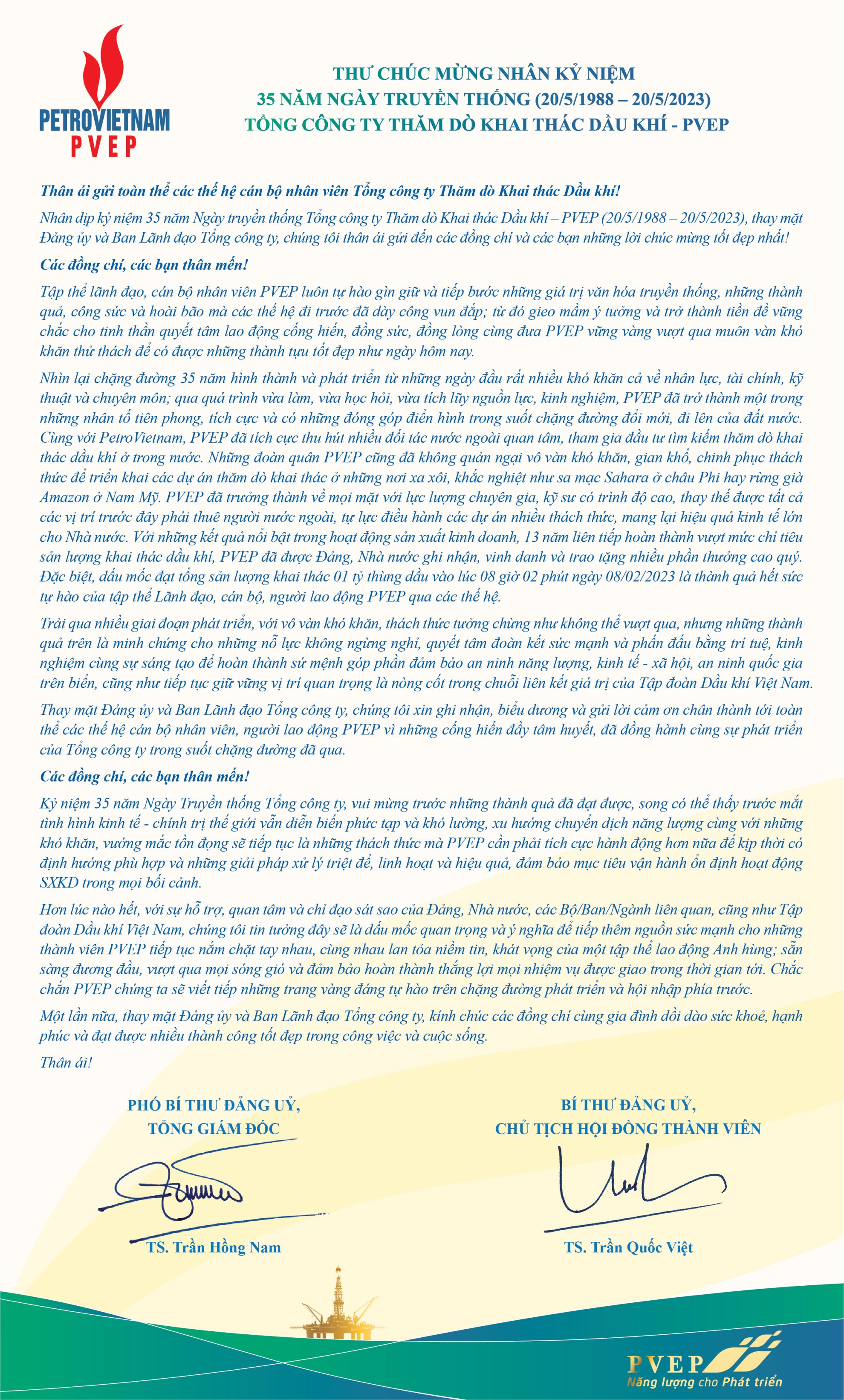 Thư chúc mừng nhân kỷ niệm 35 năm Ngày truyền thống PVEP (20/5/1988 - 20/5/2023)