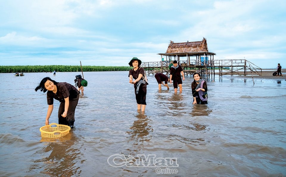 | Các nhà làm du lịch Mũi Cà Mau đang khai thác rất hiệu quả tour du lịch biển bãi Khai Long - Ðất Mũi. (Trong ảnh: Ðoàn của Bamboo Airways trải nghiệm bắt nghêu bãi Khai Long). |