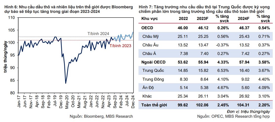 Dẫn số liệu từ Bloomberg, MBS cho biết, trong 9 tháng đầu năm 2023, nhu cầu sử dụng dầu thô và nhiên liệu trên thế giới đạt trung bình 100,7 triệu thùng/ngày, tăng 1,7% so với mức nền tương đối thấp của cùng kỳ năm 2022. Bloomberg dự phóng nhu cầu trung bình toàn thế giới năm 2023-2024 lần lượt đạt 101 triệu thùng /ngày, tăng 1,4% so với cùng kỳ và 102,34 triệu thùng/ngày, tăng 1,3% so với cùng kỳ do quan ngại về tình hình sản xuất công nghiệp trước diễn biến ảm đạm của nền kinh tế.