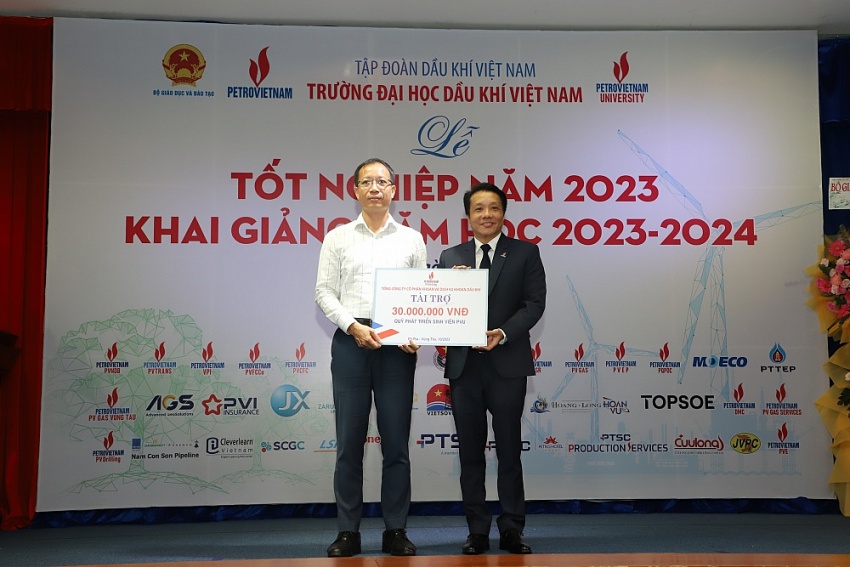 Trên tinh thần xã hội hóa giáo dục được hiện thực hóa bằng những đóng góp tài trợ, tại buổi lễ, các đơn vị trong ngành Dầu khí, các tổ chức, doanh nghiệp trong và ngoài nước đã tài trợ nhiều suất học bổng, đóng góp vào Quỹ phát triển SV và hoạt động của PVU. Đại diện các nhà tài trợ đã phát biểu và chúc mừng PVU với những thành tích đã đạt được và cam kết tiếp tục đồng hành cùng thầy trò PVU trên bước tương lai.