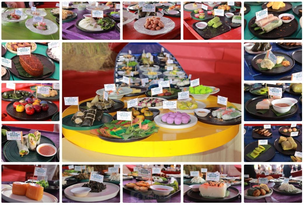Sau hơn 2 giờ chế biến, các nghệ nhân ẩm thực đã hoàn thành 200 món ăn và trưng bày. Cùng với những món bánh dân gian truyền thống nổi tiếng được nhiều người biết tới như bánh chưng, bánh dày, bánh xèo, bánh tét, bánh cống, bánh da lợn... là rất nhiều món bánh mới mang hương vị đặc trưng của địa phương như: bánh tét ngũ sắc, bánh xèo ngũ sắc, bánh ram tôm thịt, bánh nếp mặn lá chuối, bánh cuốn trứng, bánh con sùng ngũ sắc, bánh da lợn ngũ sắc, bánh bầu, bánh củ cải...