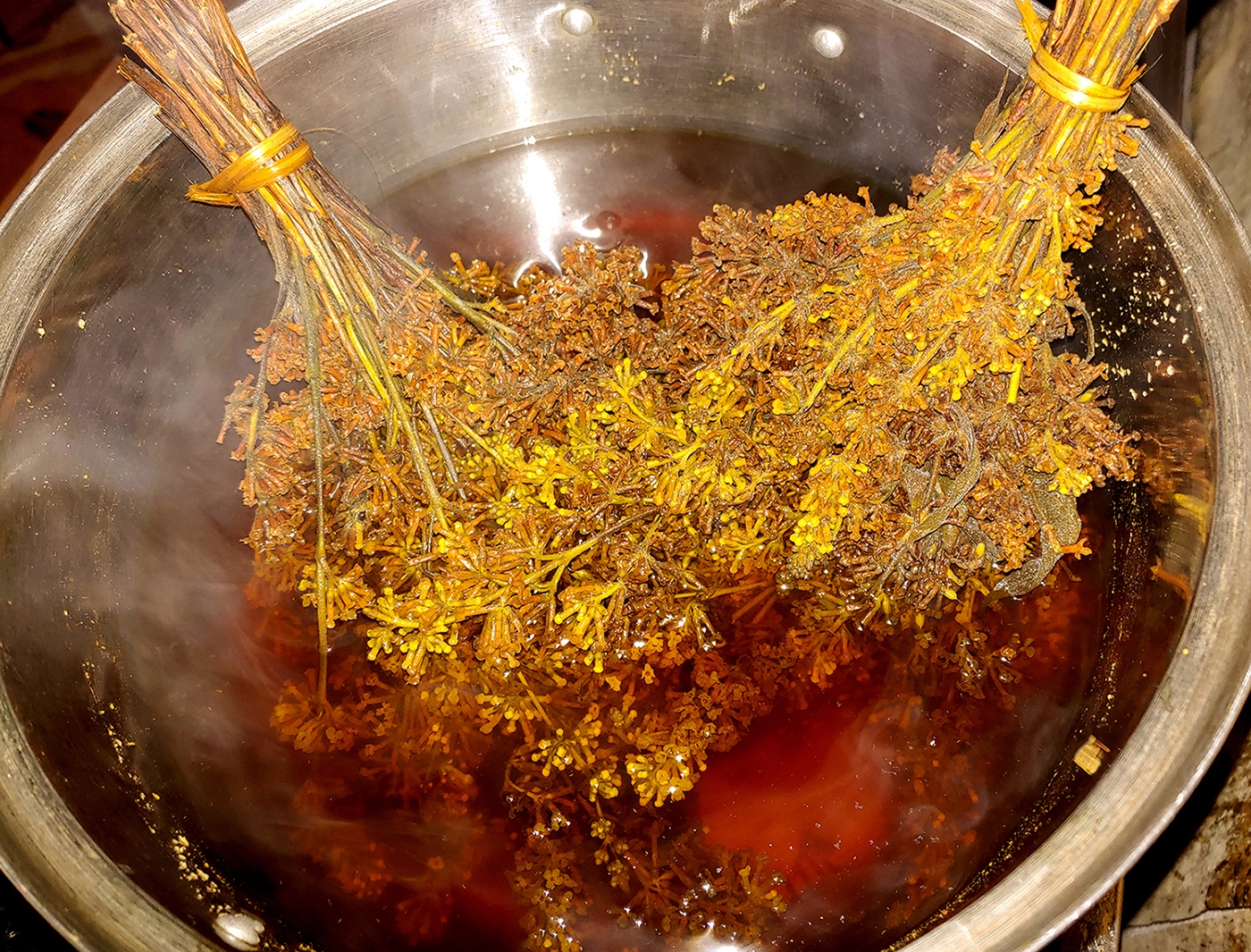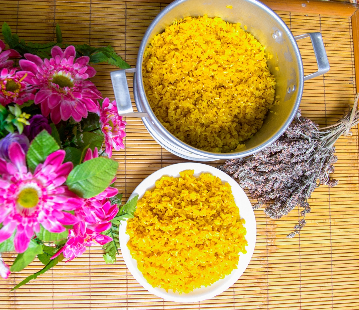 Xôi có màu vàng vì được nhuộm từ hoa của cây bjoóc phón, loại cây sống tự nhiên ở trên rừng. Cây bjoóc phón (theo tiếng Tày, Nùng) là loại cây thân gỗ, mọc tự nhiên bên các sườn núi đá, cao khoảng 1 - 3m. Cây nở hoa vào mùa xuân từ tháng 2 đến tháng 3, hoa mới nở có màu trắng, sau đó ngả màu vàng và có hương thơm rất đặc biệt.