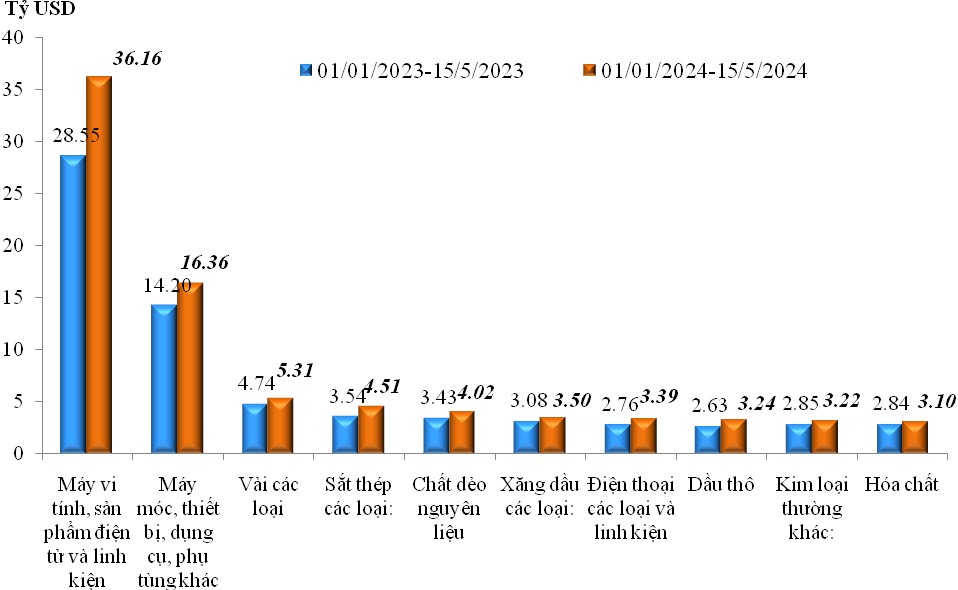 Trị giá nhập khẩu hàng hóa trong kỳ 1 tháng 5/2024 tăng so với kỳ 2 tháng 4/2024 chủ yếu ở một số nhóm hàng sau: máy vi tính, sản phẩm điện tử và linh kiện tăng 915 triệu USD, tương ứng tăng 25,5%; máy móc thiết bị dụng cụ và phụ tùng tăng 542 triệu USD, tương ứng tăng 32,2%; vải các loại tăng 203 triệu USD, tương ứng tăng 33,2%...